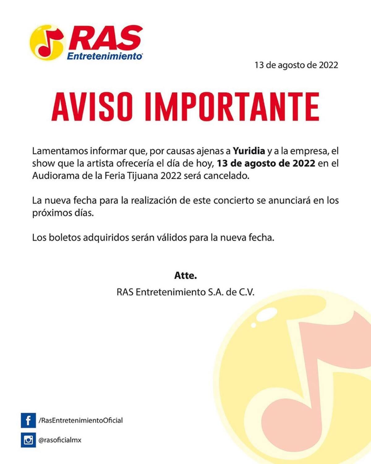 Lamentamos informar que, por causas ajenas a Yuridia y a la empresa RAS Entretenimiento, el show que la artista ofrecería el día de hoy, 13 de agosto en la Feria de Tijuana 2022 será cancelado”, informaron por medio de un comunicado los representantes de la cantante sonorense.