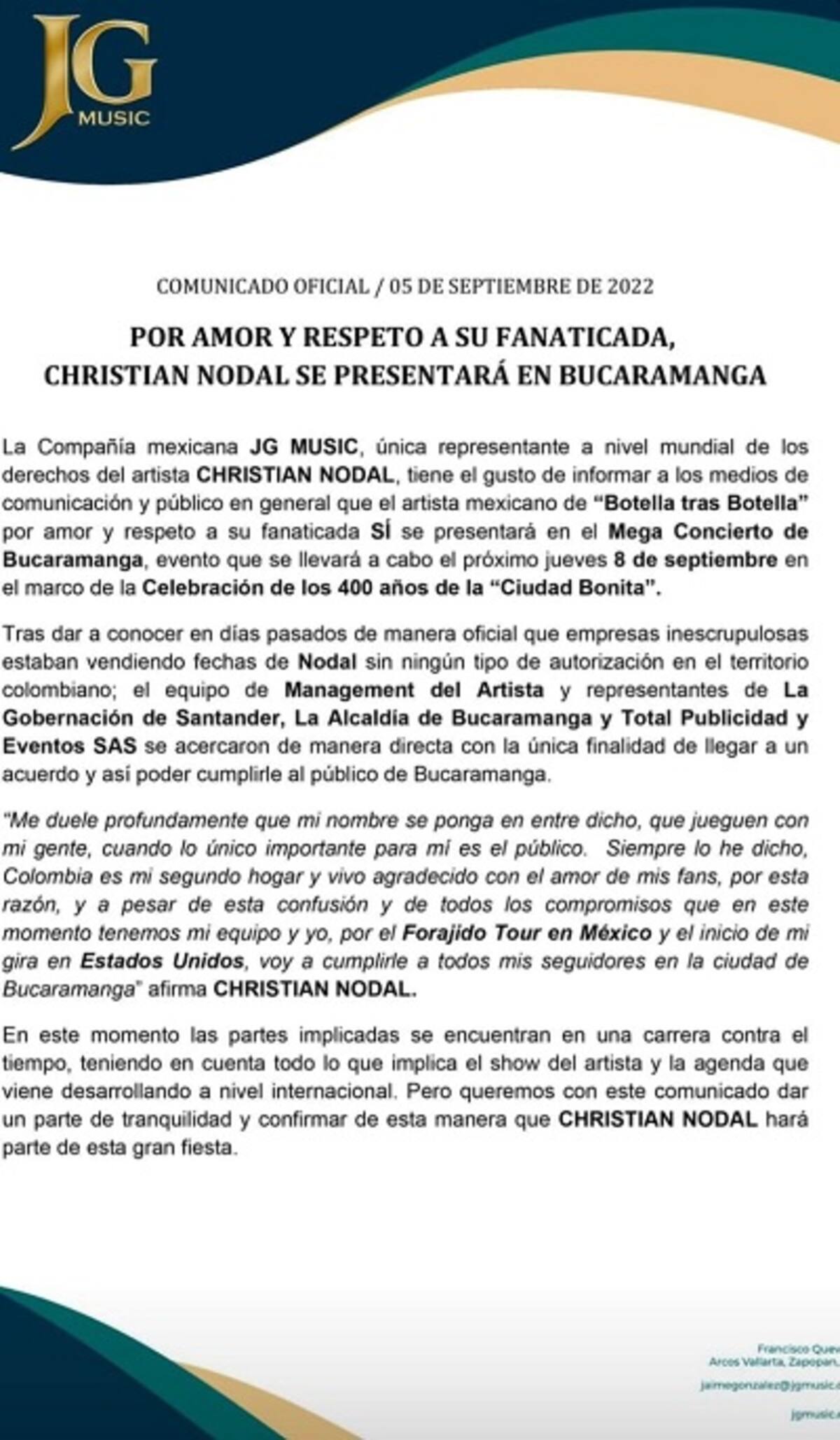 Ante esto, la compañía mexicana JG MUSIC, empresa propiedad del padre de Christian Nodal y encargada de representar al artista, se percató de los hechos y lanzaron un comunicado.