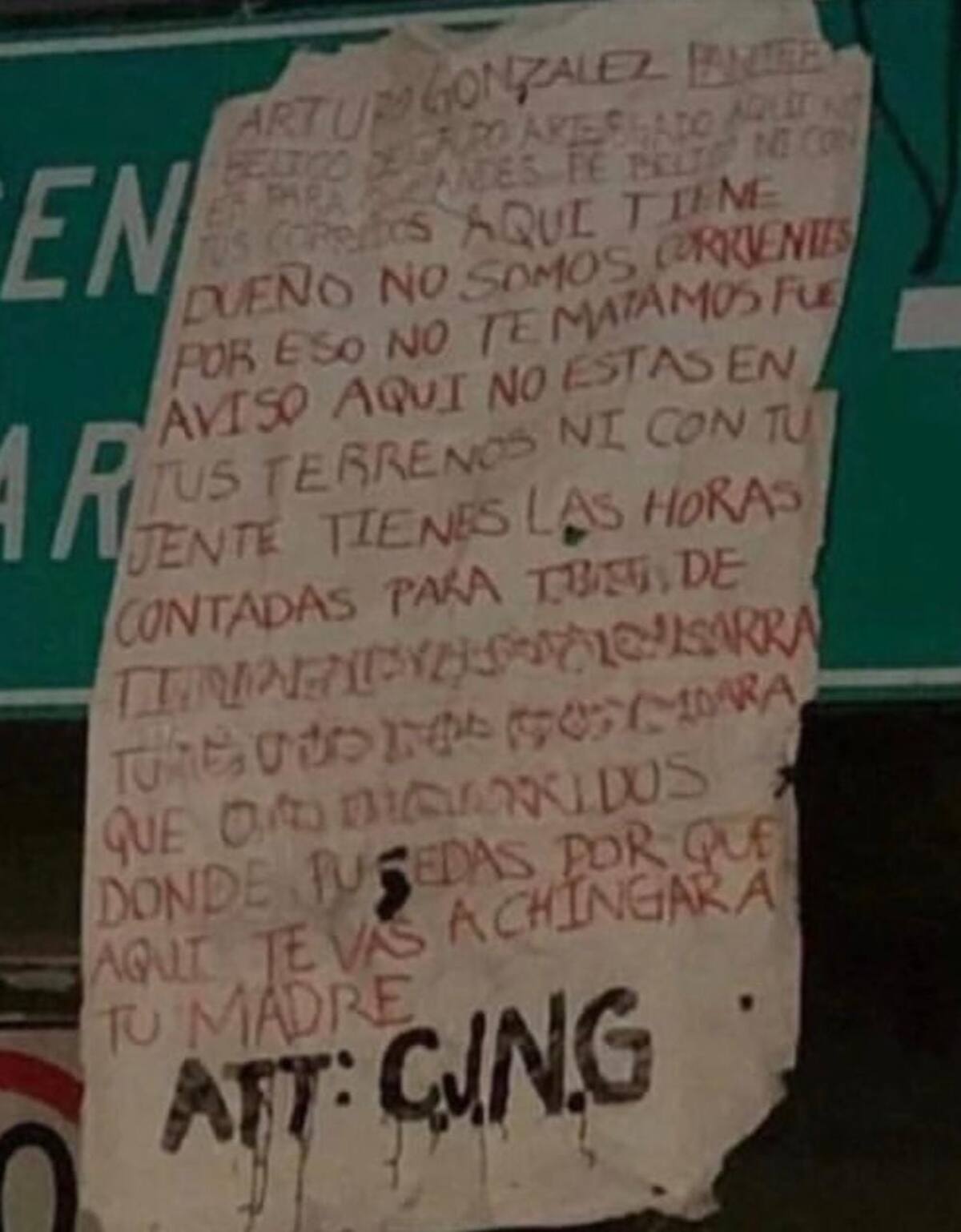 En el mensaje se lee: “Arturo González, Panter Bélico de grupo Arriesgado, aquí no es para que andes de bélico ni con tus corridos. Aquí tiene dueño, no somos corrientes, por eso no te matamos, fue aviso”.