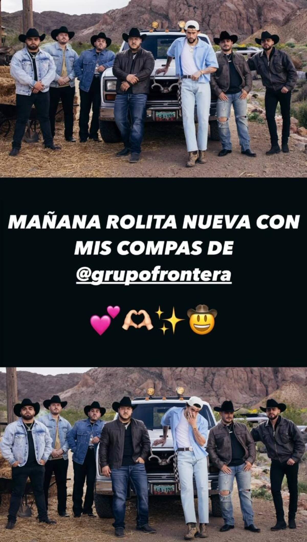 El cantante compartió una fotografía junto a los músicos, donde se les puede ver en el campo, recargados obre un auto tipo pickup, además de escribir: Mañana rolita nueva con mis compas de @grupofrontera”.