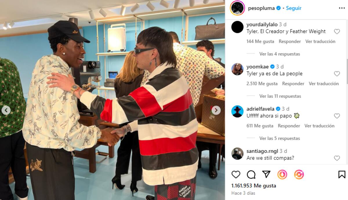 Sin embargo, lo que más llamó la atención de sus seguidores fue una serie de fotos en las que aparece junto al rapero Tyler, el creador. Aunque Peso Pluma no añadió ningún comentario en el título del post, los fans especularon sobre una posible colaboración entre ambos artistas, lo que generó entusiasmo entre su base de seguidores.