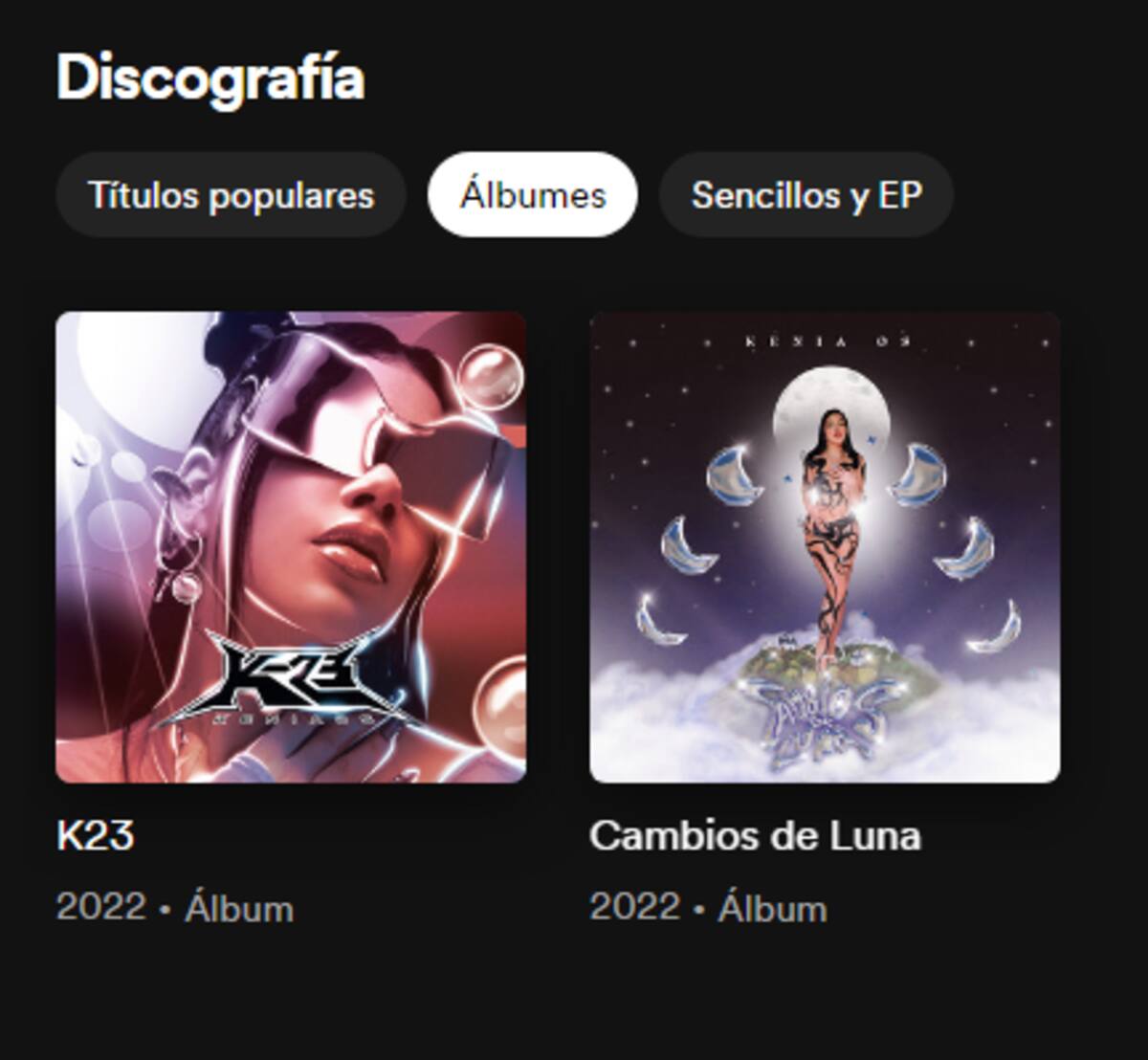 Hasta la fecha, cuenta únicamente con dos álbumes de estudio. El primero, titulado Cambios de Luna, y el segundo, K23, del cual se destaca su enorme éxito viral, "Malas Decisiones".