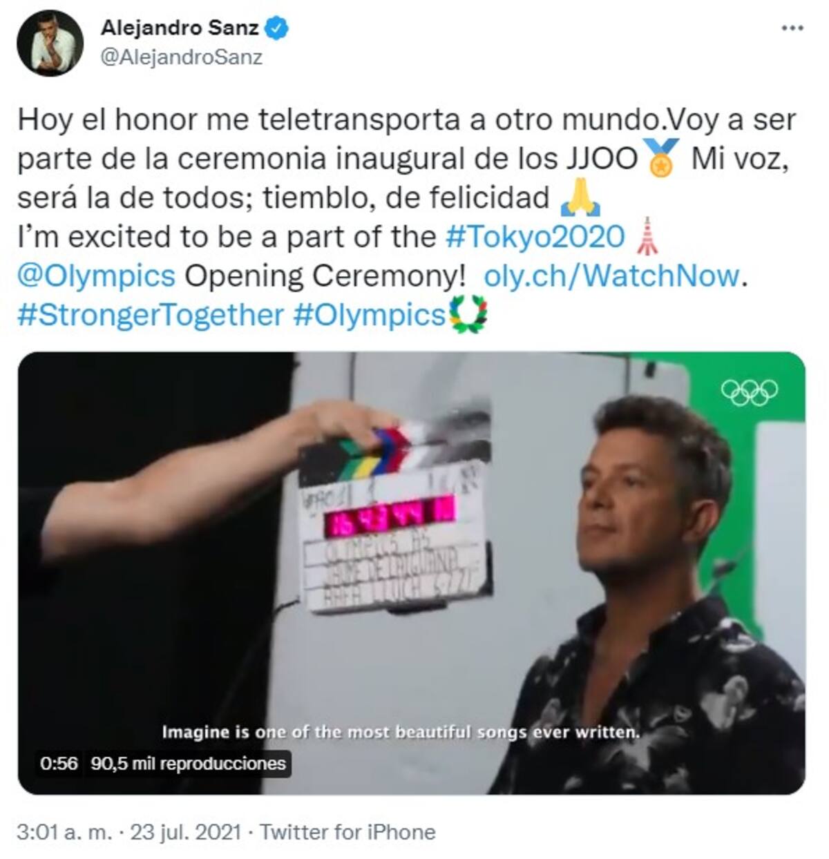 Hoy el honor me teletransporta a otro mundo. Voy a ser parte de la ceremonia inaugural de los JJ.OO. Mi voz, será la de todos; tiemblo, de felicidad. I’m excited to be a part of the #Tokyo2020 Olympics Opening Ceremony! (¡Estoy emocionado de formar parte de la ceremonia de inauguración de las Olimpiadas de #Tokio2020!), escribió Sanz junto a un enlace para disfrutar en directo de la emisión.