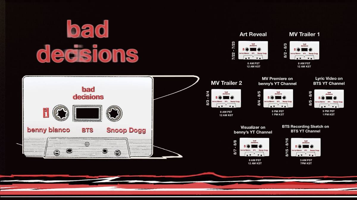 ESTADOS UNIDOS. – Aunque hace unas semanas BTS informó que se tomarían un tiempo para dedicarse a sus proyectos como solistas, este miércoles se anunció su colaboración con Snoop Dogg y Benny Blanco: “Bad Decisions”.
