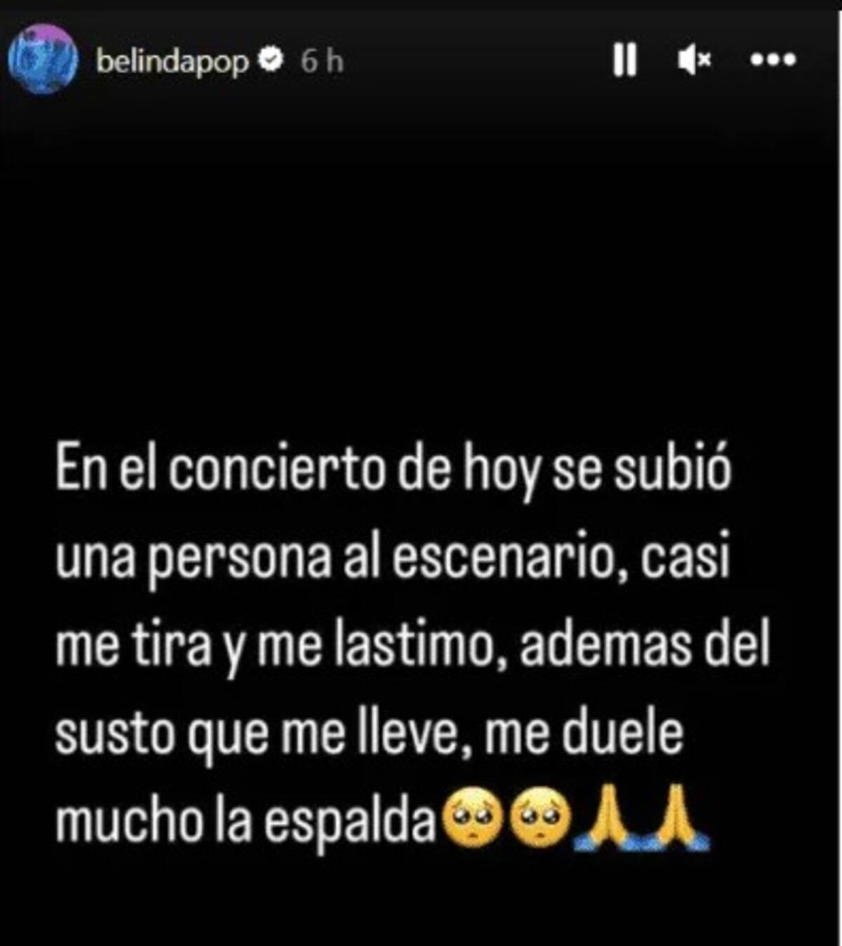 “En el concierto de hoy (por ayer) se subió una persona al escenario, casi me tira y me lastimó; además del susto que me lleve, me duele mucho la espalda”, escribió en una historia de Instagram.