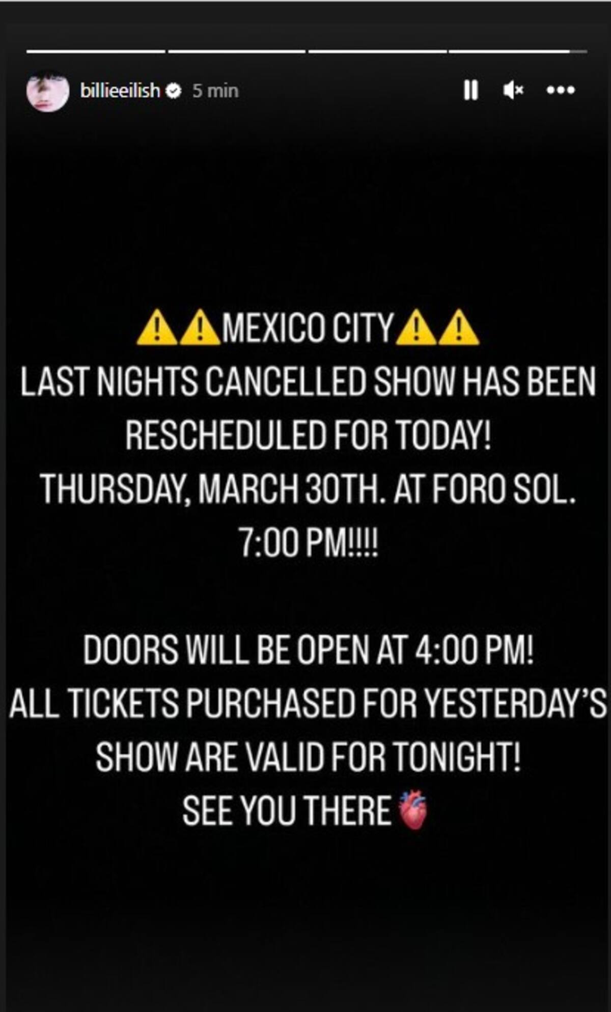 “¡Ciudad de México! El show que se canceló anoche fue pospuesto para hoy jueves, 30 de marzo en el Foro Sol a las 19:00 horas”, escribió la cantante de 21 años.