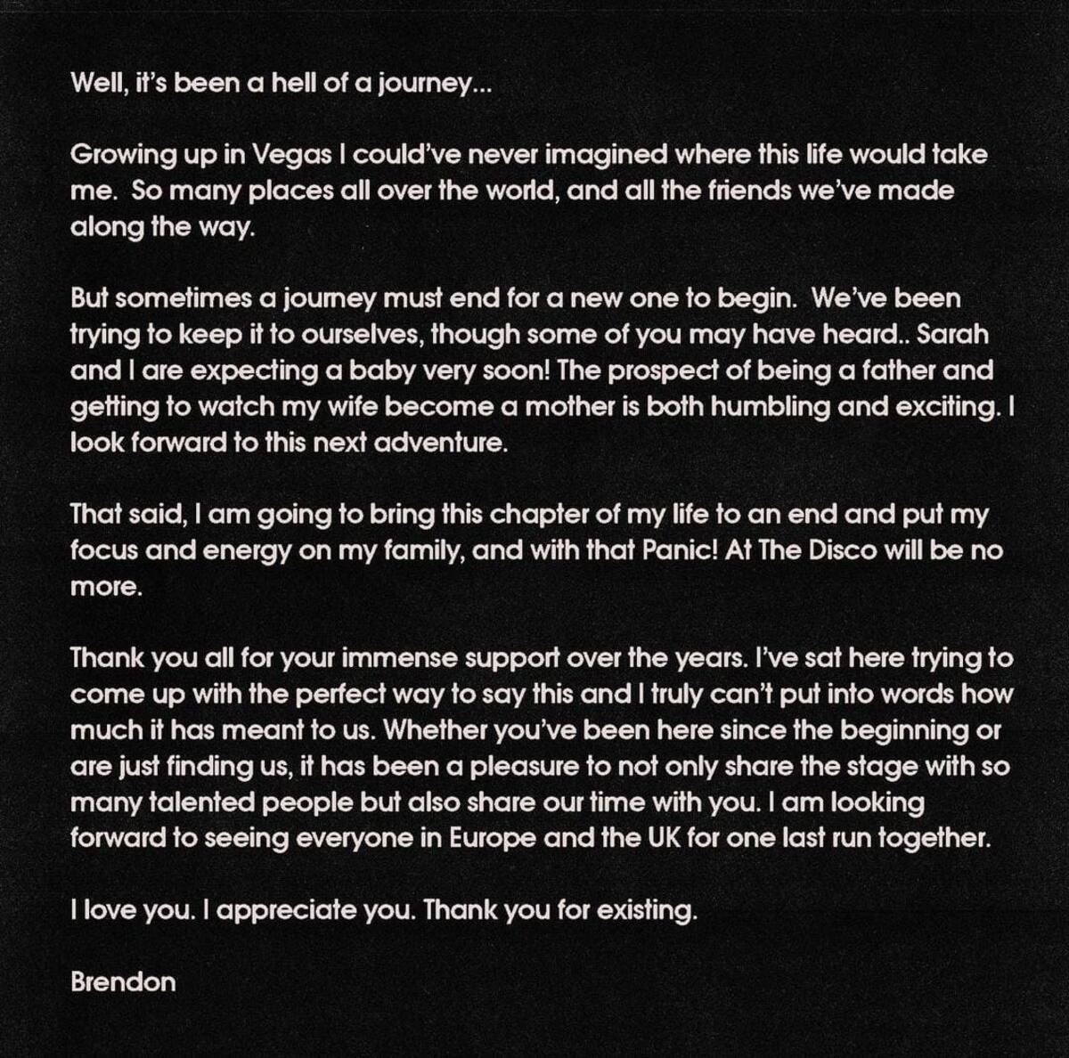 “La perspectiva de ser padre y poder ver a mi esposa convertirse en madre es humilde y emocionante. Espero con ansias esta próxima aventura. Dicho esto, voy a poner fin a este capítulo de mi vida y poner mi enfoque y energía en mi familia y con ese Panic! At The Disco ya no existirá”.