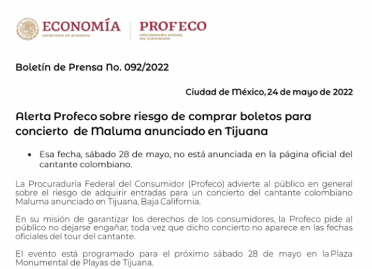 De acuerdo al comunicado de la dependencia federal, el concierto del colombiano, anunciado para este 28 de mayo en Tijuana, Baja California, no está programado por el cantante, lo que da entender que quienes adquirieron boletos podrían ser víctimas de estafa.