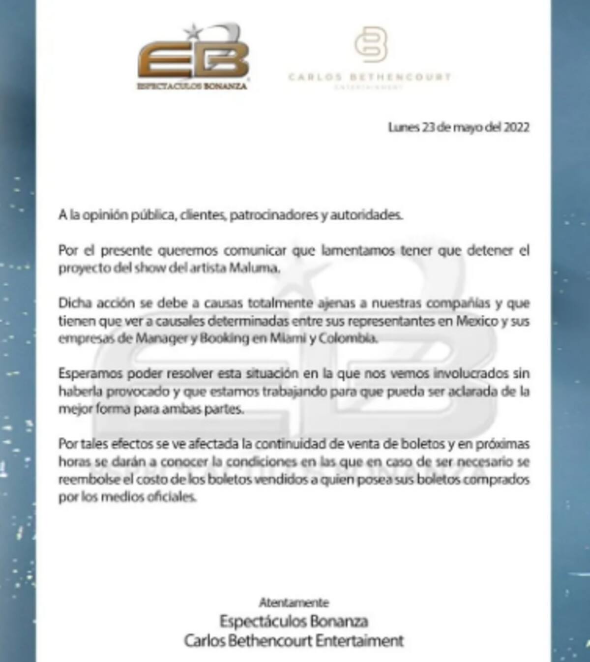 Por otra parte, la supuesta agencia que manejaba la venta de boletos del concierto, "Espectáculos Bonanza", anunció este martes 24 de mayo la cancelación de dicho show.