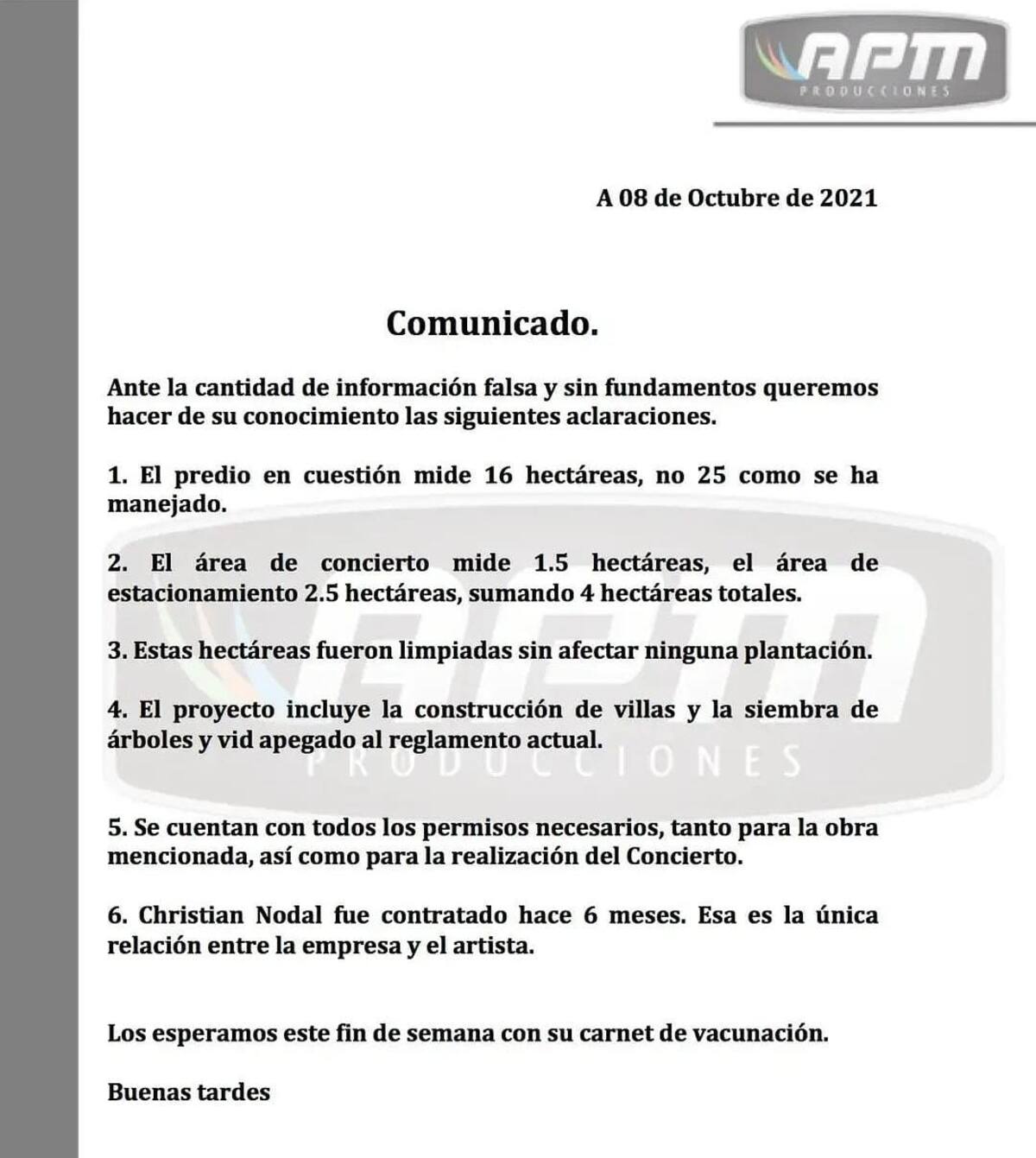 A pesar de las declaraciones del organismo, APM Producciones reiteró la invitación al concierto de Nodal, asegurando que las “hectáreas fueron limpiadas sin afectar ninguna plantación”.
