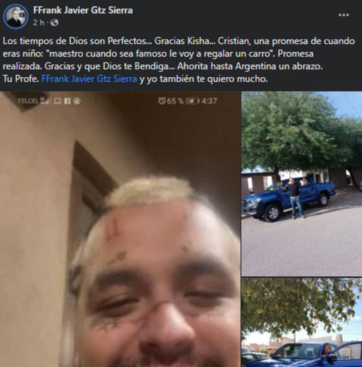 A través de redes sociales, el maestro Francisco Javier Gutiérrez Sierra, compartió una imagen en la que muestra un pick-up en color azul último modelo y aseguró que Nodal se la compró.