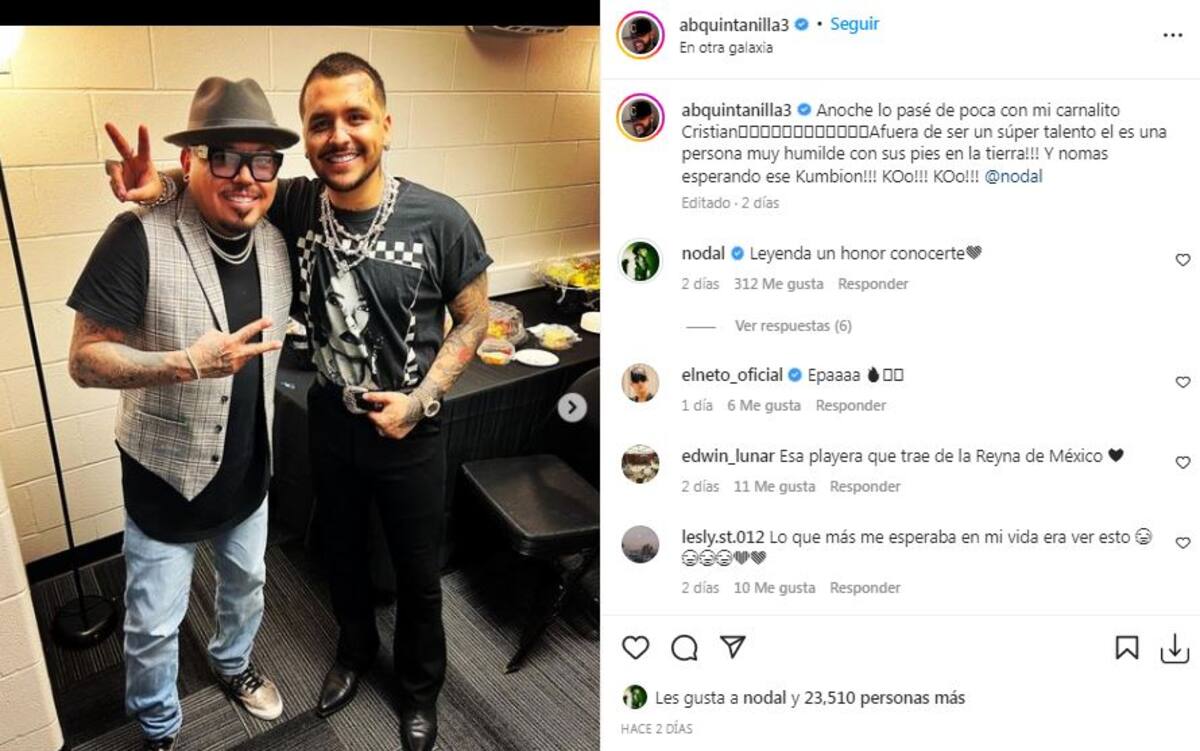 El intérprete de temas como “De los besos que te di” y “Vivo en el seis” estuvo muy contento con la visita de Quintanilla, a quien además comprometió para ayudarlo a producir una de sus nuevas canciones, el joven de 23 años dijo públicamente que tiene una letra en la que le gustaría trabajar con él.