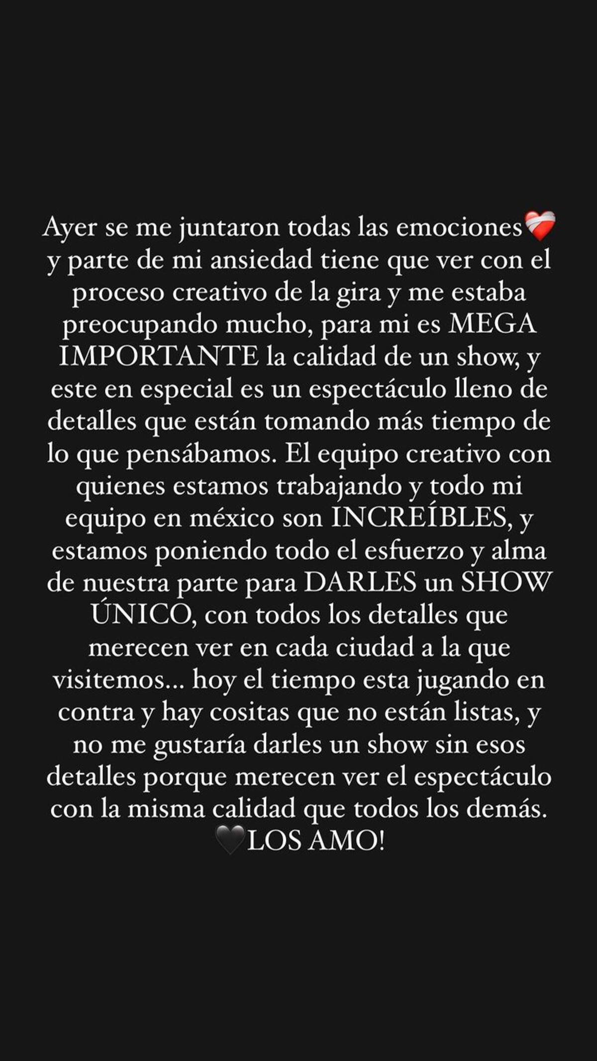 A través de sus historias de Instagram, la actriz y cantante de 27 años señaló que se encontraba mal emocionalmente porque para ella el proceso creativo de su gira era lo más importante y en esta ocasión se le estaba saliendo de las manos y le estaba tomando más tiempo.