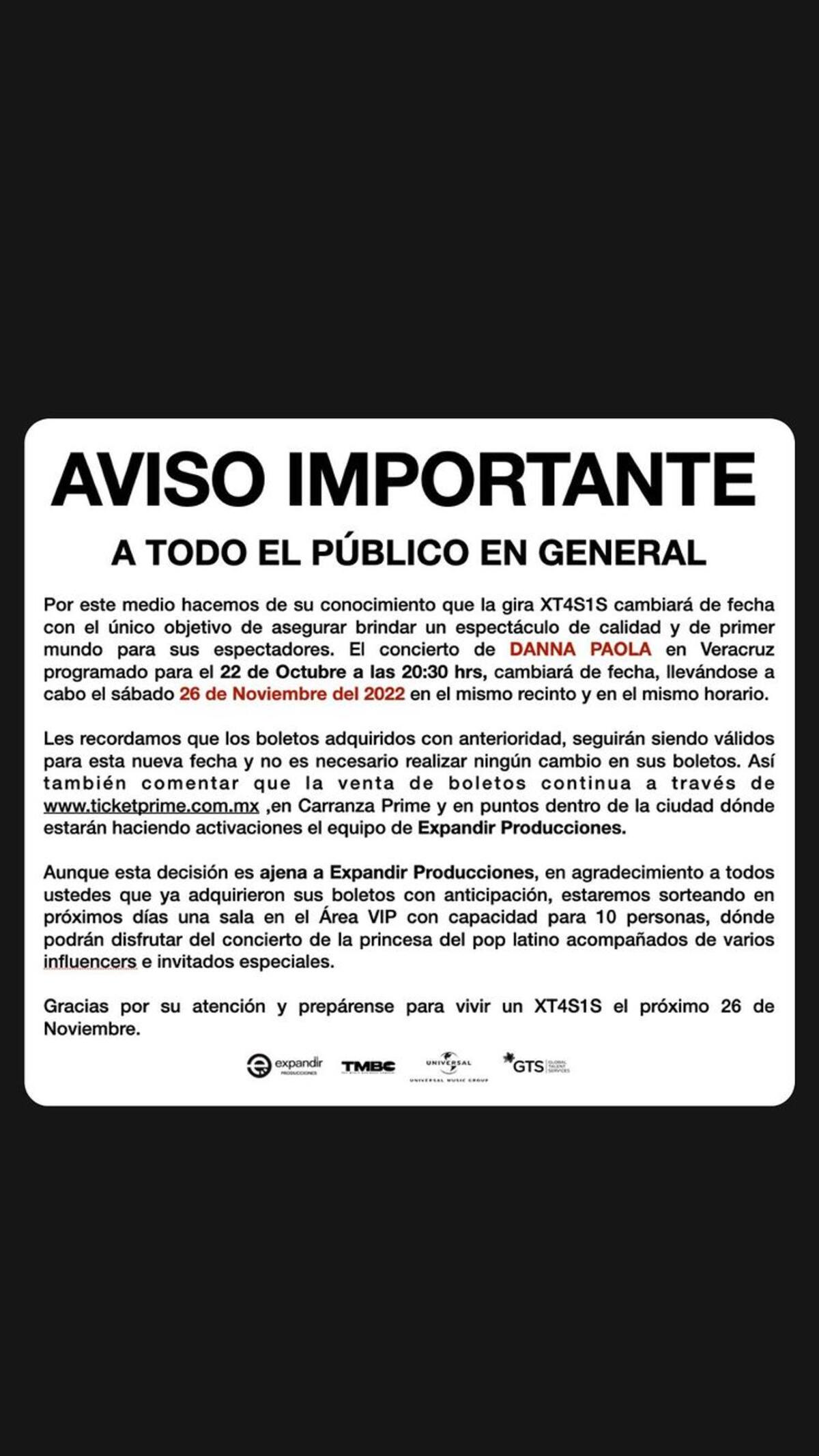 Hoy el tiempo nos está jugando en contra y hay cositas que no están listas y no me gustaría darles un show sin esos detalles porque merecen ver el espectáculo con la misma calidad que todos los demás. Los Amo”, externó Danna Paola en su red social.