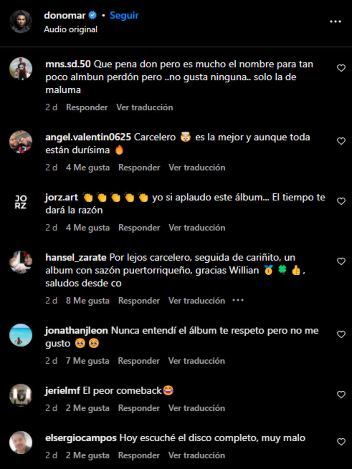 "Este álbum es malísimo... tú eres mi artista favorito desde niño... has perdido el toque, no tienes el nivel de antes... Lamentable, no sé si es tu ego lo que no te deja ver más allá", "Te sigo desde que tenía 12 años y ahora tengo 28. Considero que soy un gran fan de tu música. Sin embargo, este álbum reciente es muy malo. No hay ni una buena canción", “No se hagan ilusiones, seguirá lanzando música tropical y al diablo con el reguetón. Eso es lo que hay”, se lee en las críticas.