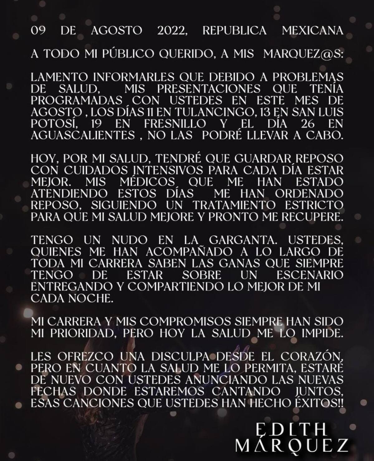 “Lamento informarles que debido a problemas de salud mis presentaciones que tenía programadas con ustedes en este mes de agosto, los días 11 en Tulancingo, 13 en San Luis Potosí, 19 en Fresnillo y el día 26 en Aguascalientes, no las podré llevar a cabo”, se lee en el mensaje.