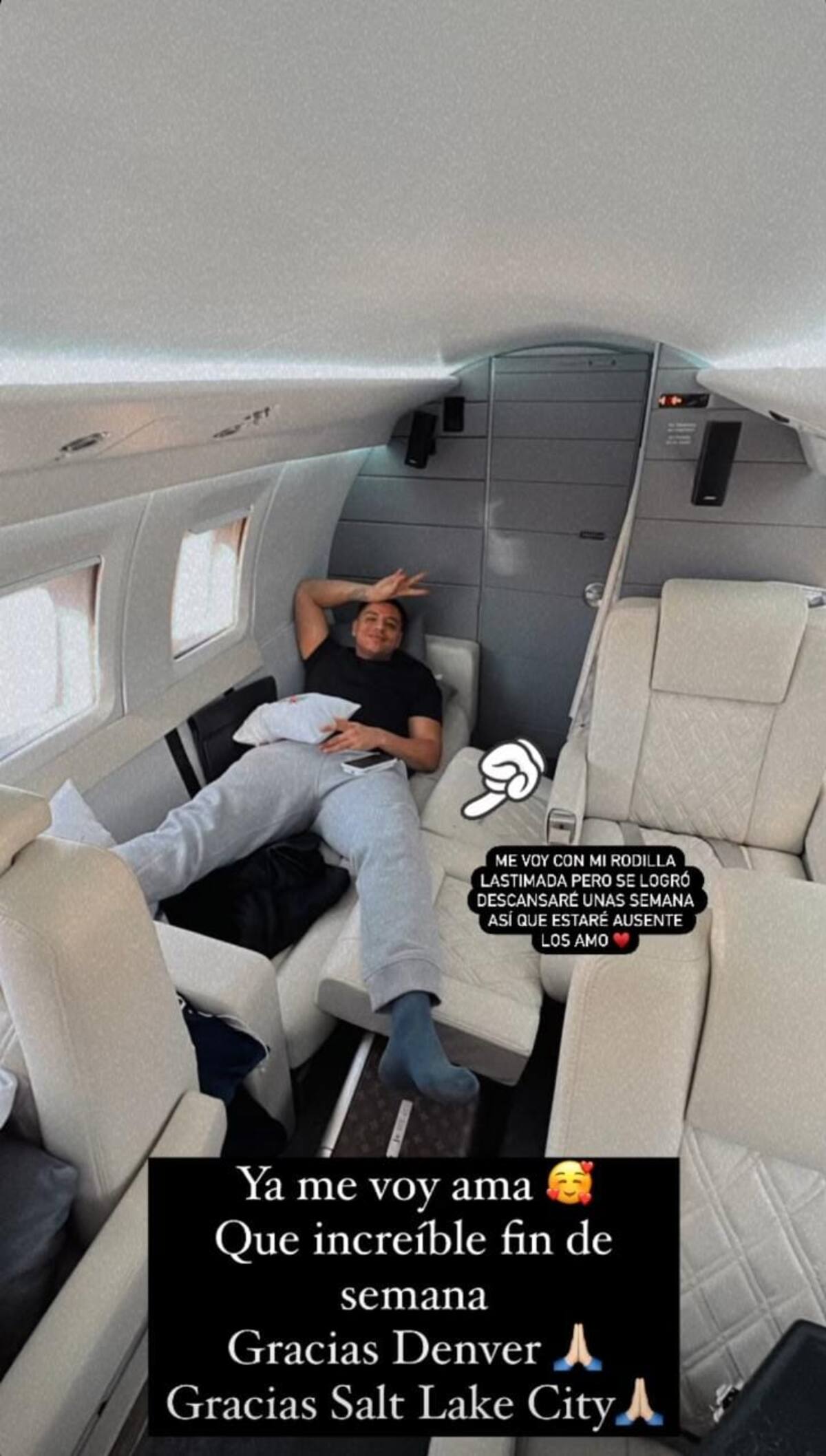 El cantante subió una foto en la que se le veía recostado adentro de un jet privado, informando que se tomaría una semana de descanso a causa de su rodilla.