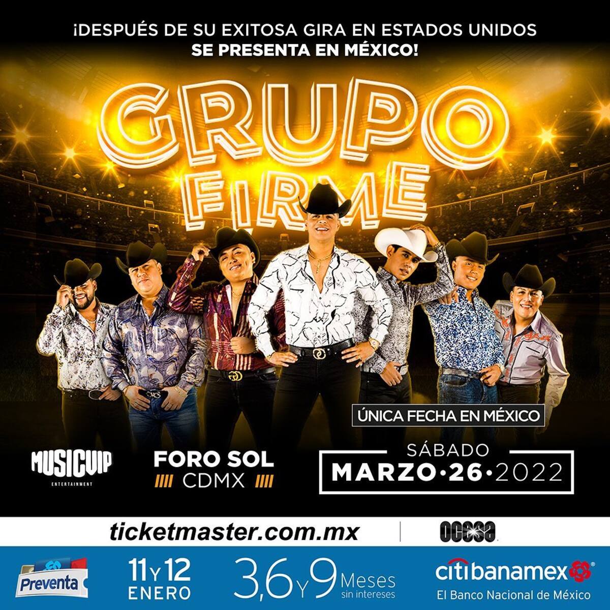Grupo Firme estará en Foro Sol el sábado, 26 de marzo de este año, donde los fans se darán cita a partir de las 20:00 horas para escuchar temas como “Cada Quién”, “En tu perra vida” y “Gracias”.
