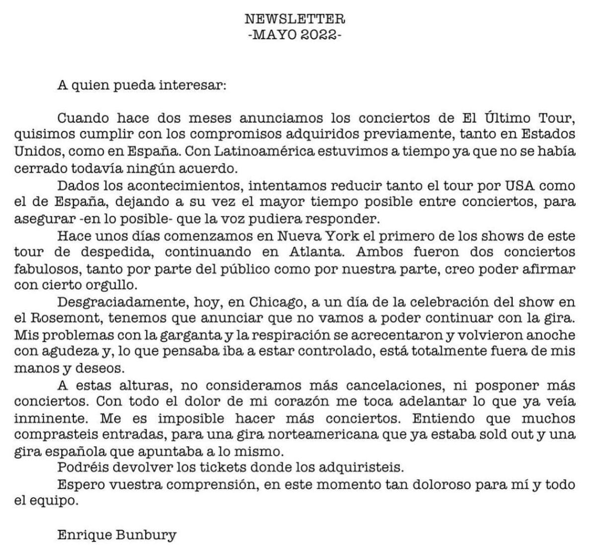 Bunbury deja sin terminar un total de 22 fechas entre ciudades estadounidenses y españolas, muchas de las cuales ya habían logrado ser sold out.