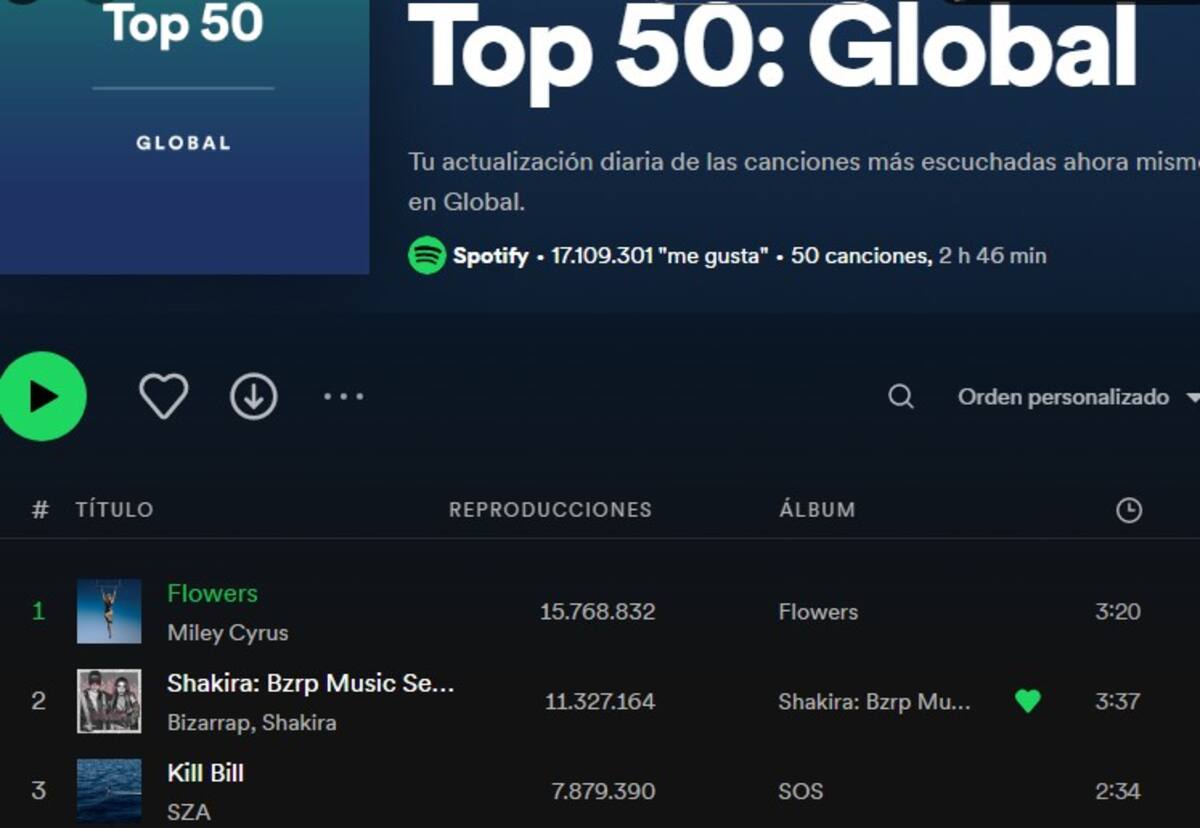 “Flowers” cuenta con 15 millones 768 mil 832 reproducciones, mientras que la sesión #53 que Shakira hizo con Bizarrap tiene 11 millones 327 mil 164 reproducciones a menos de una semana de estreno. En tercer lugar está “Kill Bill” de SZA con 7 millones 879 mil 390.