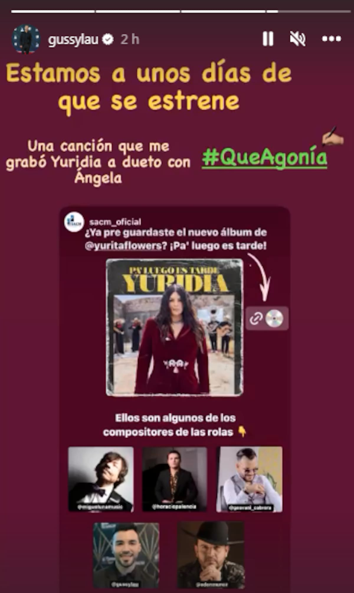 Estamos a unos días de que se estrene una canción que me grabó Yuridia a dueto con Ángela", escribió por medio de sus historias, así como destapó a los otros creadores de contenido, que en total son cinco.