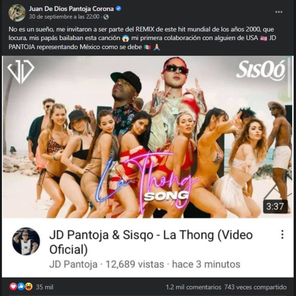 No es un sueño, me invitaron a ser parte del remix de este hit mundial de los años 2000. Qué locura, mis papás bailaban esta canción”, escribió Juan de Dios Pantoja en su cuenta de Facebook.