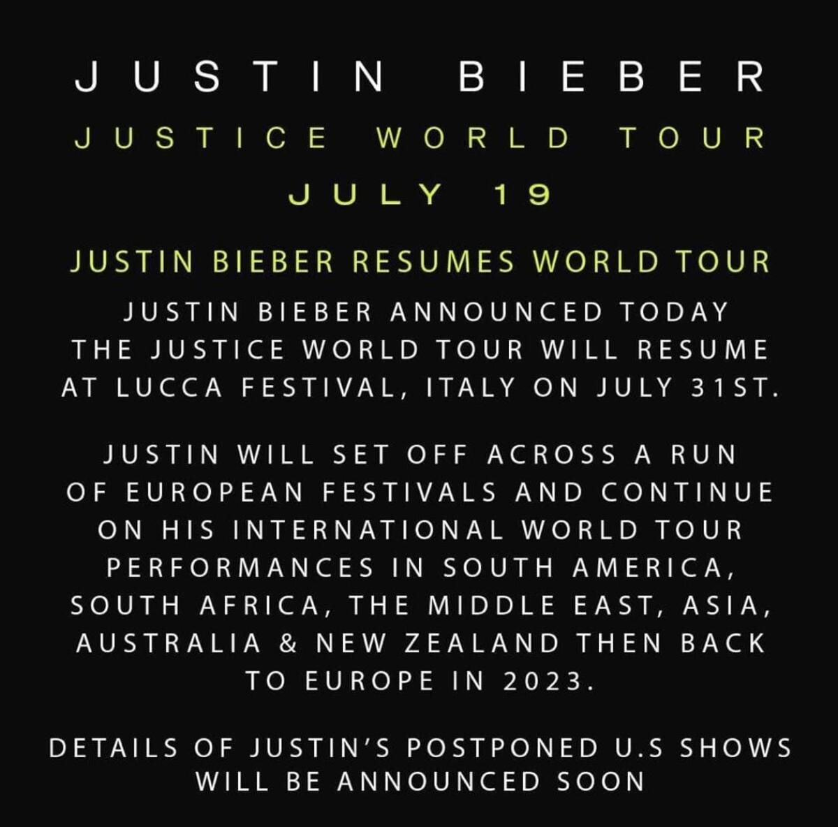 ESTADOS UNIDOS. – Este martes se informó a través de la cuenta de instagram de “justicetour” que Justin Bieber retomaría su gira internacional este próximo 31 de julio en Italia, dentro del festival Lucca.