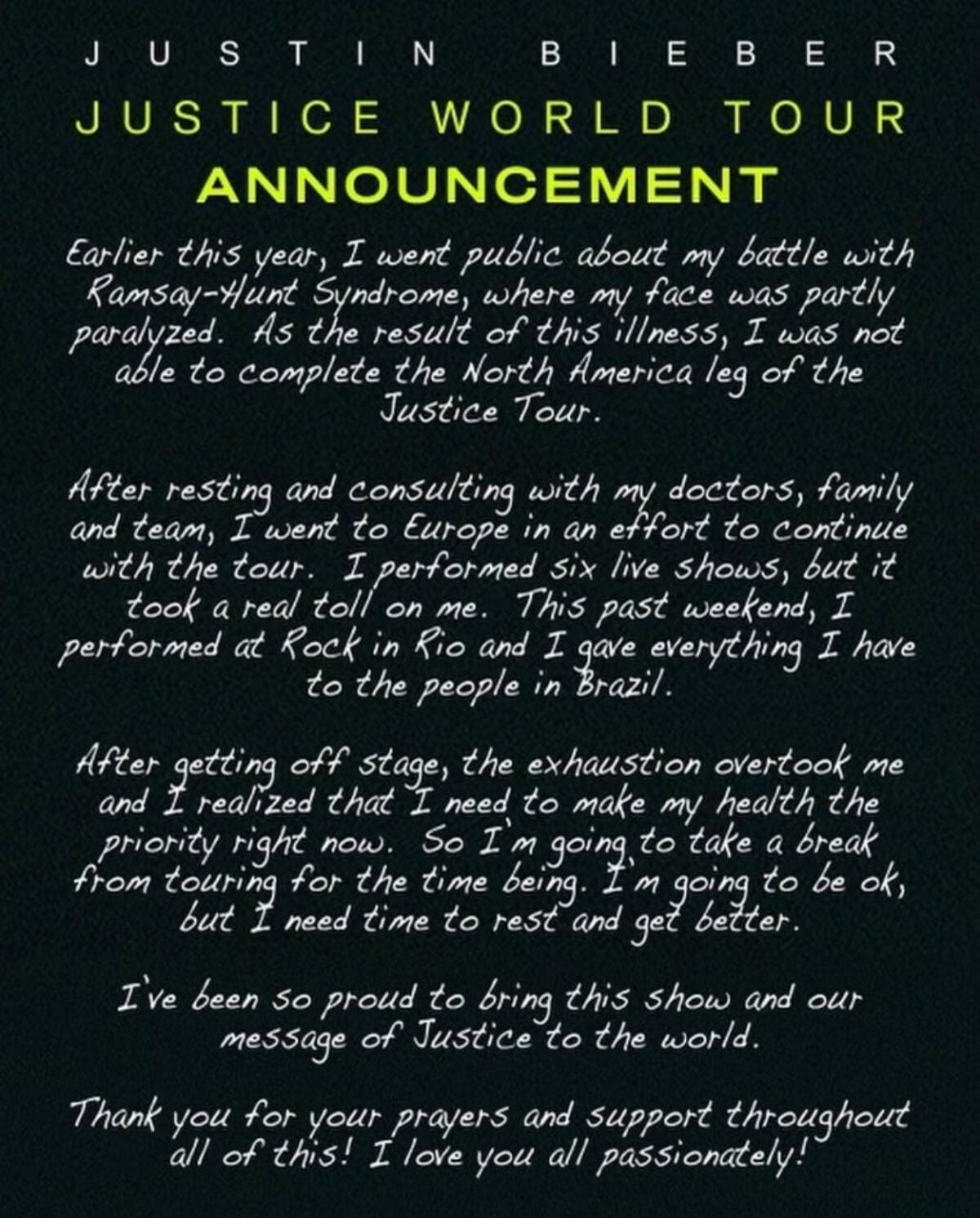 Dentro del comunicado compartido en las redes sociales de Justin, se lee: “El fin de semana pasado me presenté en Rock in Rio y le di todo lo que tenía a la gente de Brasil. Después de bajar del escenario, el agotamiento me superó y me di cuenta de que necesito hacer de mi salud la prioridad en este momento”.