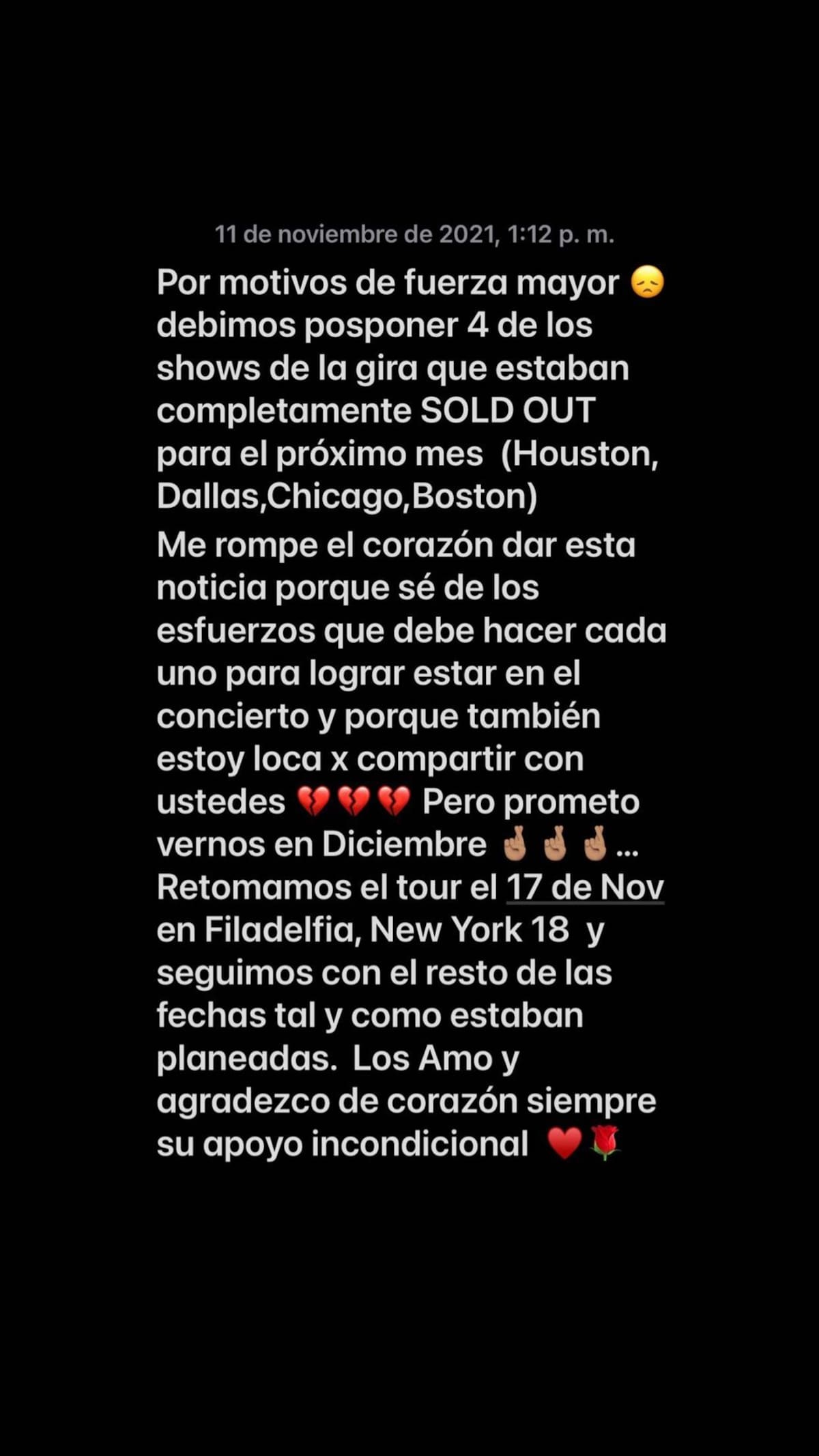 Por motivos de fuerza mayor debimos posponer cuatro de los show de la gira que estaban completamente sold out para el próximo mes (Houston, Dallas, Chicago, Boston)”, explicó la ex novia de Anuel AA.