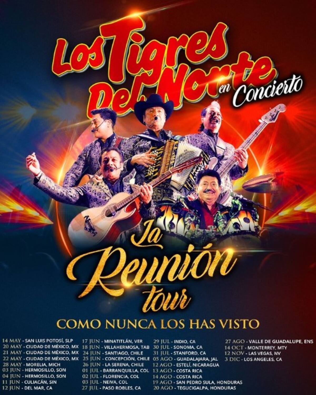 Por otro lado, Los Tigres del Norte anunciaron su gira “La Reunión Tour”, la cual comienza el 14 de mayo en San Luis Potosí, y culmina el 03 de diciembre en Los Ángeles, California.