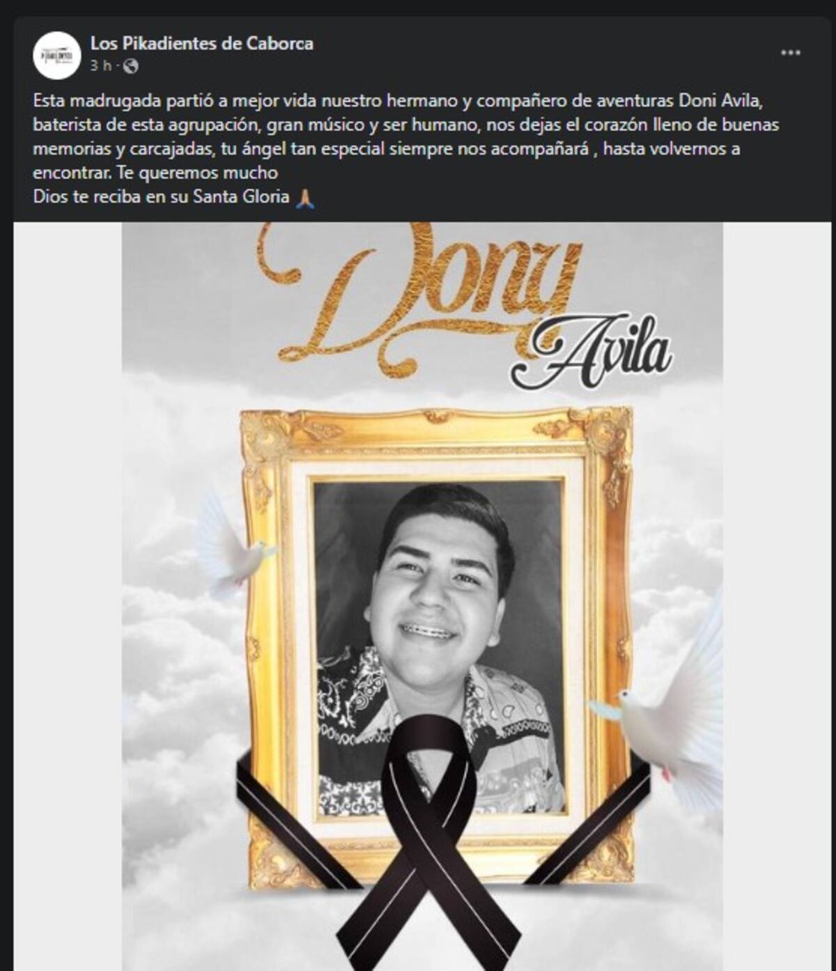 Esta madrugada partió a mejor vida nuestro hermano y compañero de aventuras Doni Ávila, baterista de esta agrupación, gran músico y ser humano, nos dejas el corazón lleno de buenas memorias y carcajadas, tu ángel tan especial siempre nos acompañará, hasta volvernos a encontrar. Te queremos mucho. Dios te reciba en su Santa Gloria”, escribieron Los Pikadientes de Caborca.