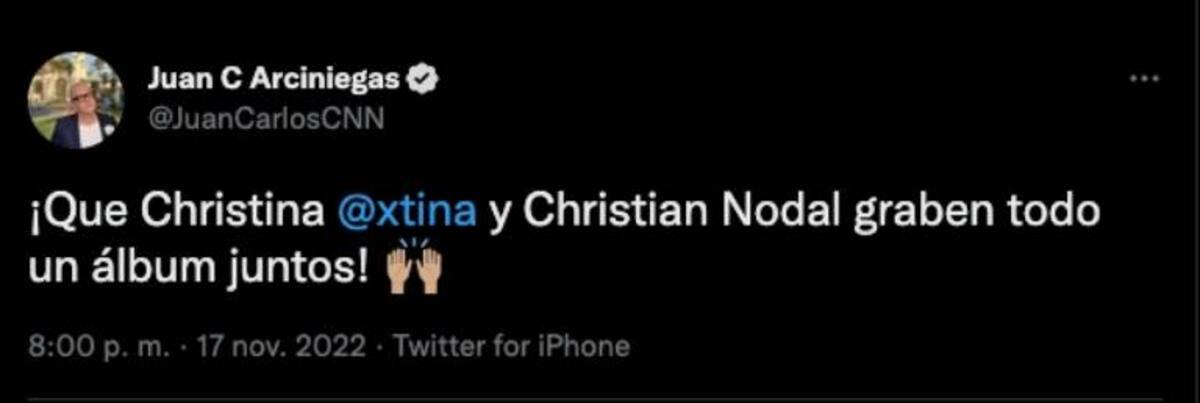 Tal es el caso de Juan Carlos Arciniega quien es experto de cine y trabaja para CNN, pues en sus redes sociales éste pide que no solo sea un dueto, sino que Xtina y Nodal deberían grabar todo un disco juntos, pues lo que vio en el escenario fue un derroche de talento de ambos cantantes.
