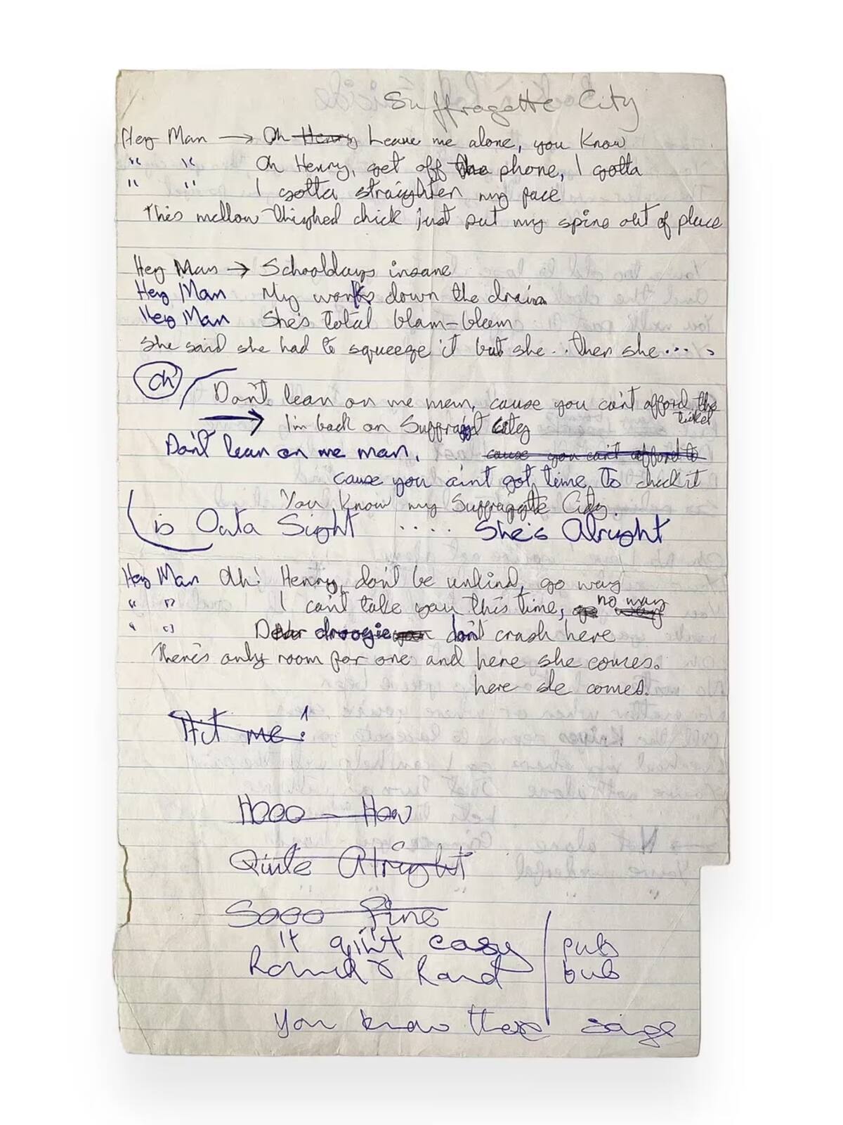 Los manuscritos, escritos de puño y letra por Bowie en ambas caras de una hoja de papel tamaño A4, presentan diversas correcciones y tachaduras que ofrecen una fascinante visión del proceso creativo del artista. Además, incluyen notas relacionadas con la estructura y el ritmo de las canciones, como la célebre frase "Wham bam thank you ma’am" que cierra "Suffragette City".