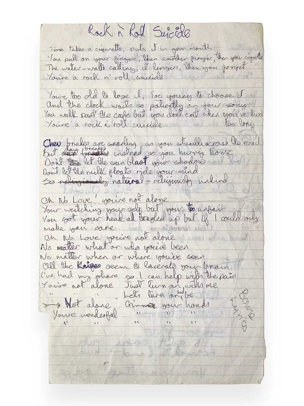 Los manuscritos de dos icónicas canciones de David Bowie, el legendario músico británico que falleció en 2016, saldrán a subasta el próximo 28 de noviembre con un precio estimado de 100.000 libras esterlinas, aproximadamente 123.750 dólares. Estas valiosas piezas corresponden a las letras de "Rock ‘n’ Roll Suicide" y "Suffragette City", dos de los temas destacados del álbum The Rise and Fall of Ziggy Stardust and the Spiders From Mars, lanzado en 1972 y considerado una obra maestra del glam rock.