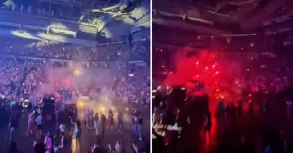 Algunos videos compartidos en redes sociales captaron el momento en el que los cohetes comenzaron su espectáculo en la sección de piso del Scotiabank Arena de Toronto.