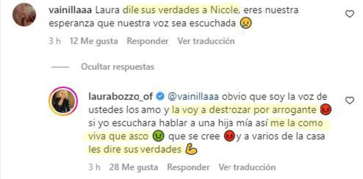 Obvio que soy la voz de ustedes los amo y la voy a destrozar por arrogante si yo escuchara hablar a una hija mía así me la como viva que asco que se cree y a varios de la casa les dire sus verdades”, escribió Laura Bozzo en comentarios de su publicación en Instagram.