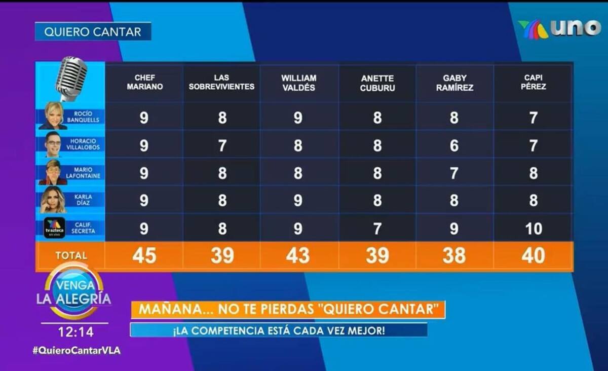 Hasta el momento las calificaciones van así: Anette Cuburu 39 puntos; Chef Mariano 45; Las sobrevivientes 39; William Valdés 43; Gaby Ramírez 38; “El Capi” Pérez 40.