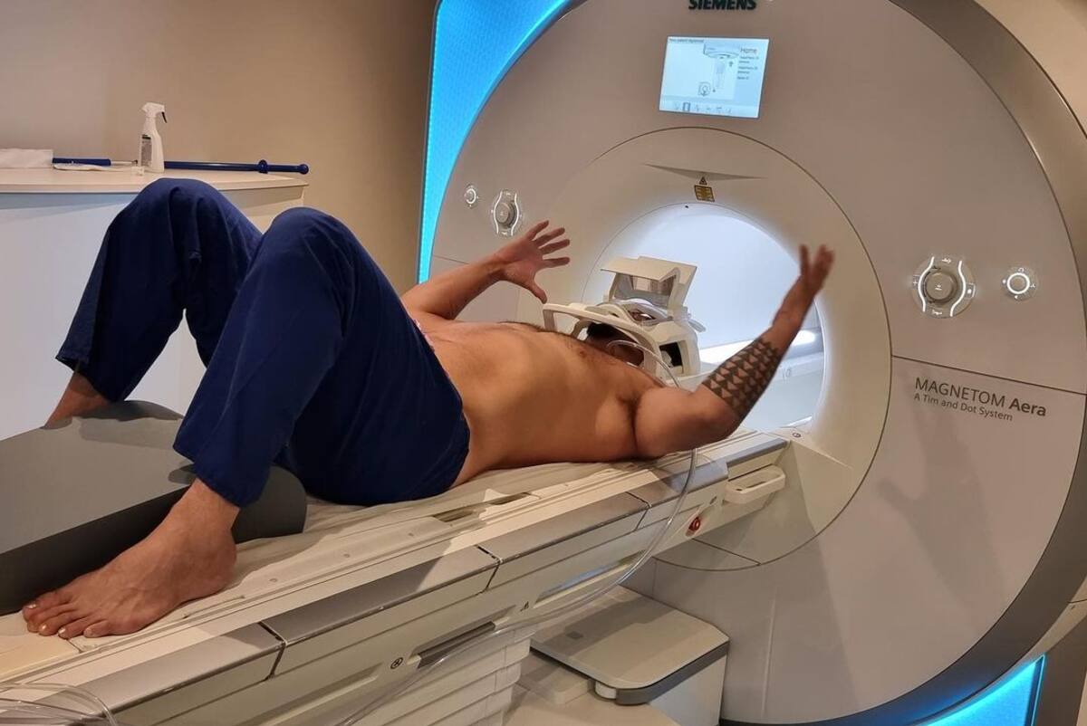 En la instantánea se ve al actor de 42 años recostado dentro de un escáner de resonancia magnética, con el cual se determina el daño que recibió en el cerebro por el golpe.