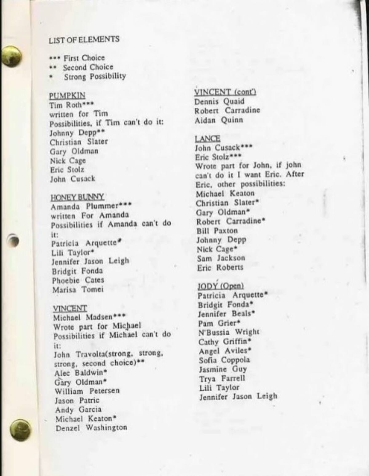 Quentin declaró que “En Internet están hablando algo sobre mi lista de deseos del elenco de Pulp Fiction. No sabía exactamente quién quería que hiciera este o aquel papel, así que escribí una lista gigante con un montón de nombres. Quería que todos fueran aprobados previamente y no sabía si iba a funcionar o si me iba a llevar bien con esa persona o si iba a hacer un buen trabajo. Sólo quería que los aprobaran”.