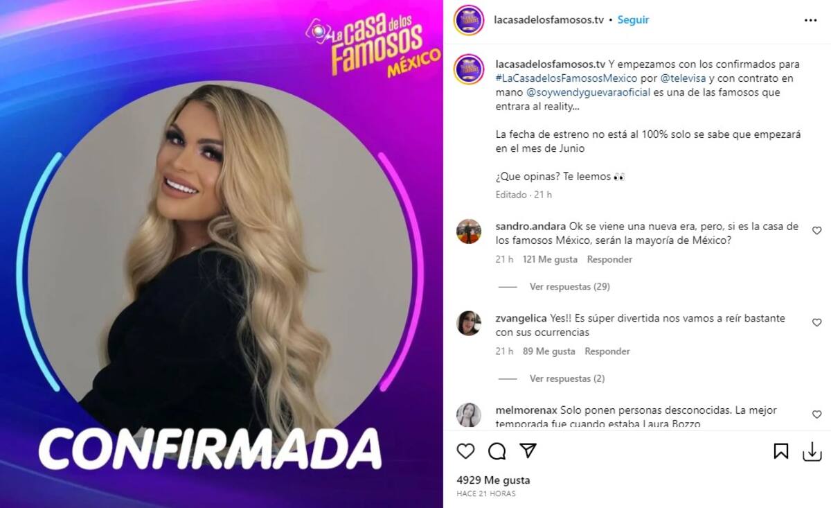 De la misma manera, se informó que la influencer y cantante Wendy Guevara, de “Las Perdidas”, es una de las primeras confirmadas en entrar al reality “La Casa de los Famosos: México”.