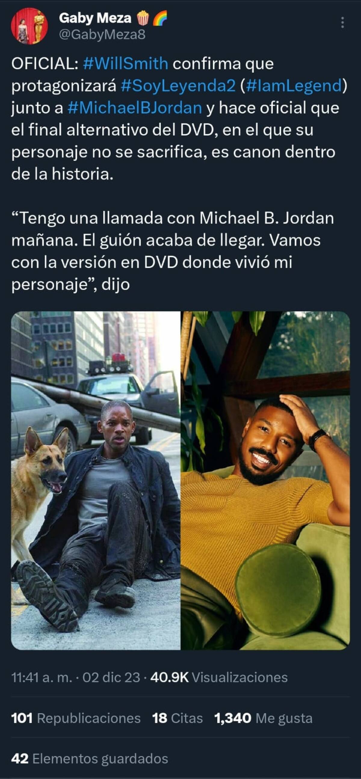 En un emocionante anuncio, el aclamado actor Will Smith confirmó su participación en la tan esperada secuela de la exitosa película de ciencia ficción Soy Leyenda (2007). No solo eso, sino que reveló que compartirá el protagonismo con Michael B. Jordan, reconocido como uno de los actores más destacados de Hollywood en la actualidad.