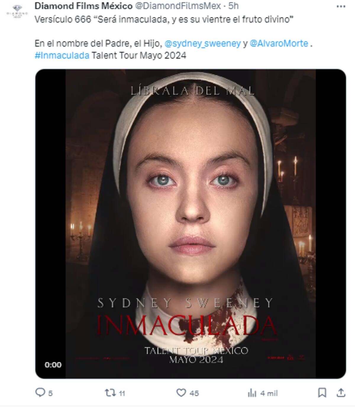 La actriz Sydney Sweeney y el actor Álvaro Morte visitarán la Ciudad de México el próximo 1° de mayo para promocionar la película de terror "Inmaculada", una cinta que promete suspenso, incertidumbre y terror psicológico. La película, distribuida por Diamond Films, nos ofrece una faceta actoral diferente de Sydney Sweeney, conocida por sus roles en "Euphoria" y "Madame Web", así como la presencia de Álvaro Morte, reconocido por su participación en "La Casa de Papel".