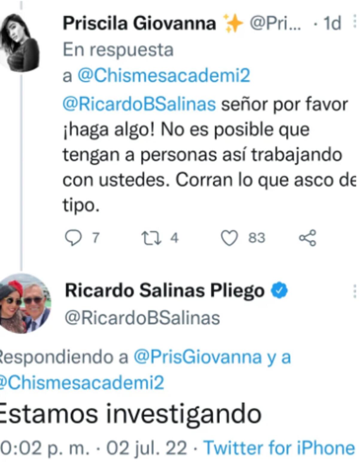 La presión ha sido tal que el caso ha escalado hasta los oídos de Ricardo Salinas Pliego, dueño y presidente de TV Azteca, quien a través de sus redes sociales prometió dilucidar el caso de supuesto acoso sexual de manera interna.
