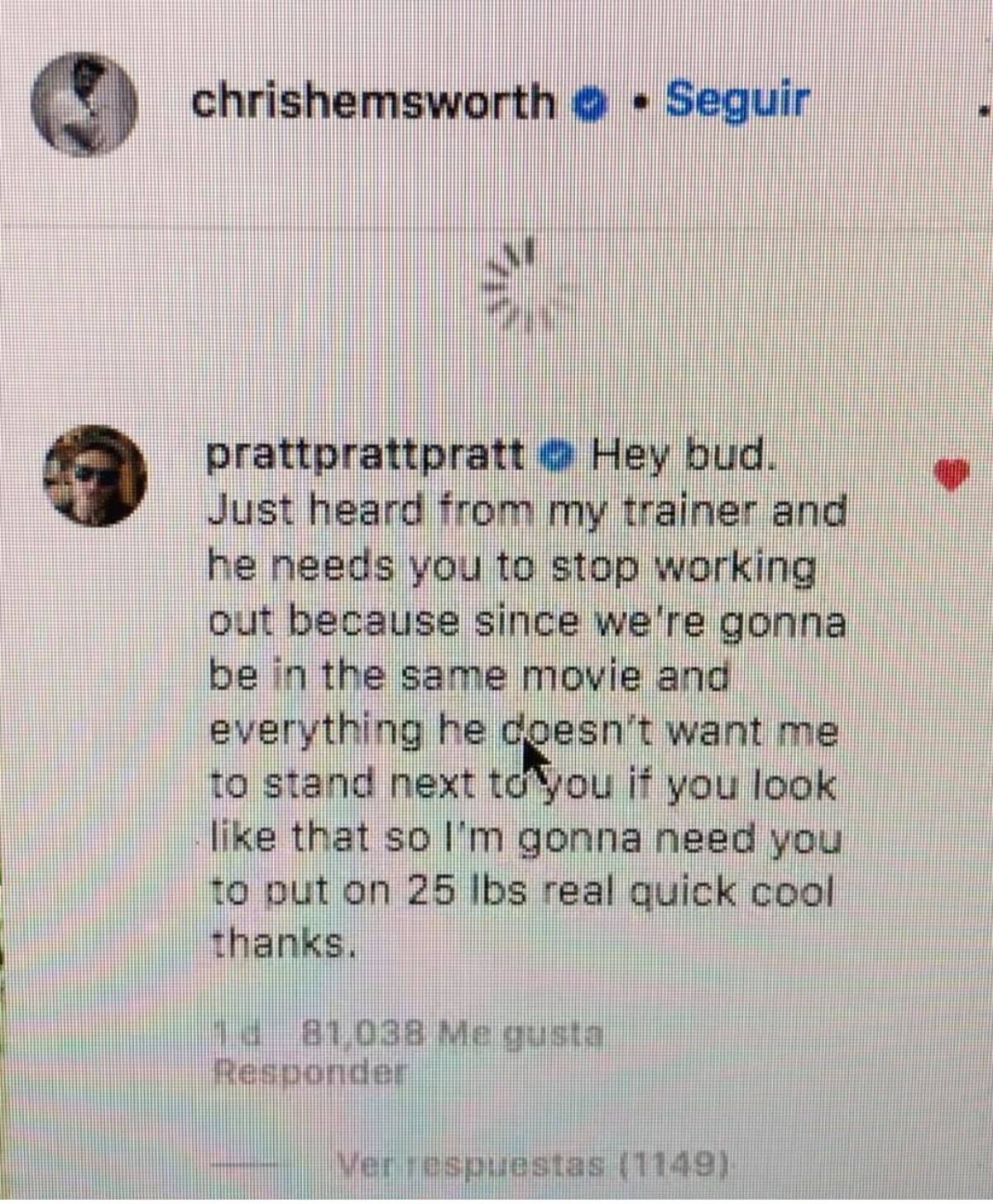 Para no quedarse atrás Hemsworth respondió a Pratt insinuando que su figura cortada en la imagen es simplemente el resultado de un filtro de fotos.