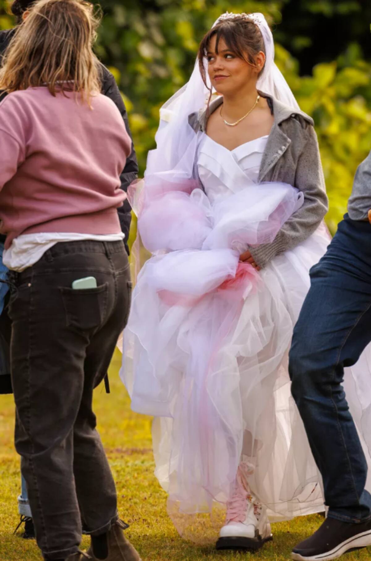 Recientemente, People publicó fotografías del set de “Beetlejuice 2”, donde se puede ver a Ortega y Ryder caracterizadas para una aparente escena de boda. Las imágenes fueron capturadas durante el rodaje de la secuela en Hertfordshire, Inglaterra. Ortega luce sonriente y elegante, luciendo un vestido de novia blanco y rosa que combina con su calzado.
