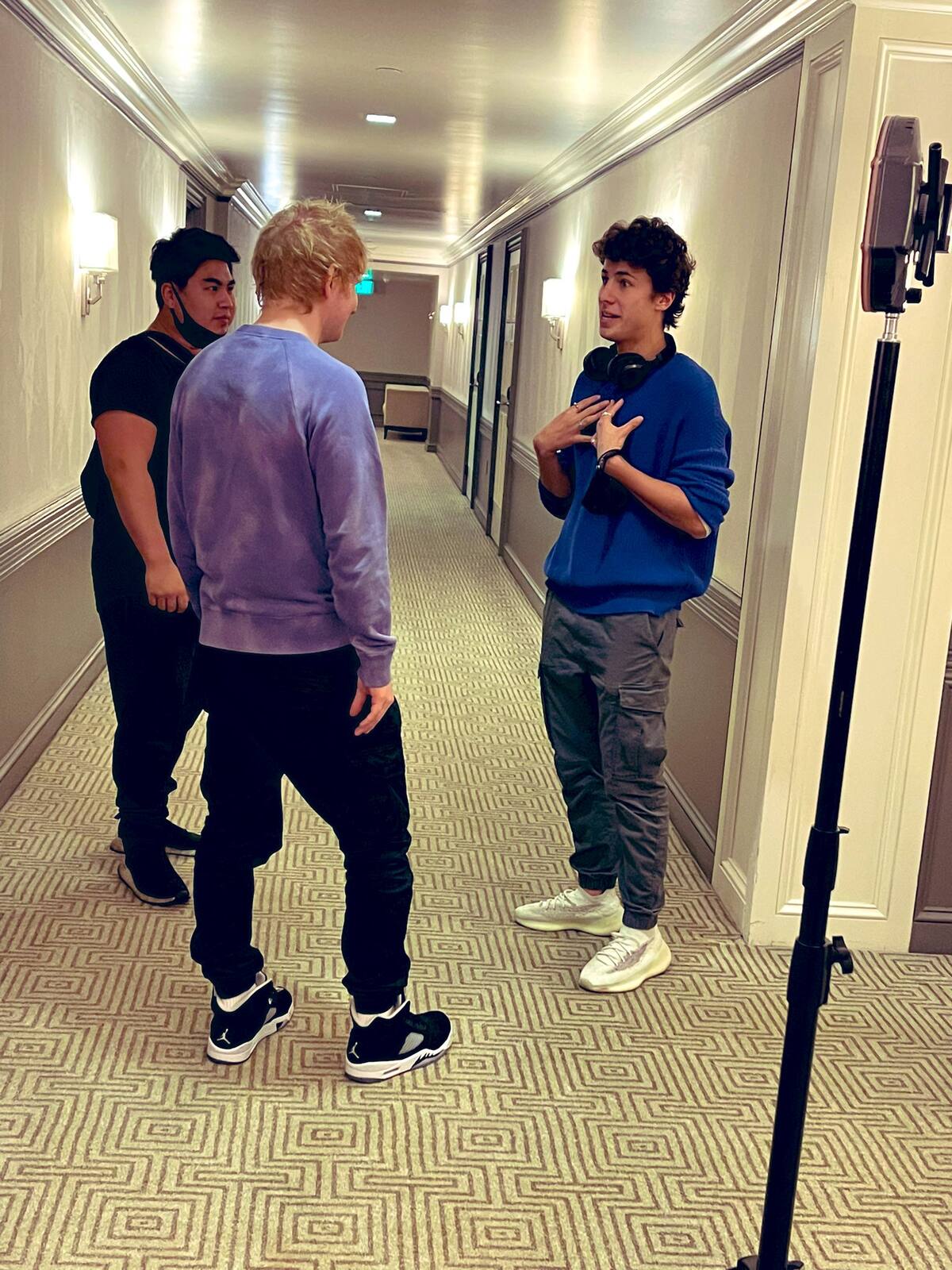 En la instantánea se ve a Ed Sheran y a Juanpa Zurita dentro de lo que parece ser un hotel. El conductor de “Quién es la máscara” aparece hablando con el cantante que presta atención.