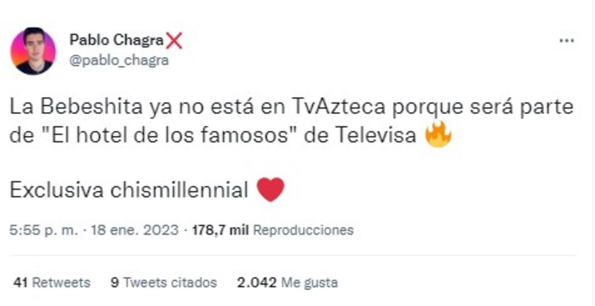 ‘La Bebeshita’ ya no está en Tv Azteca porque será parte de ‘El hotel de los famosos’ de Televisa”, informó el “Chismillennial”.