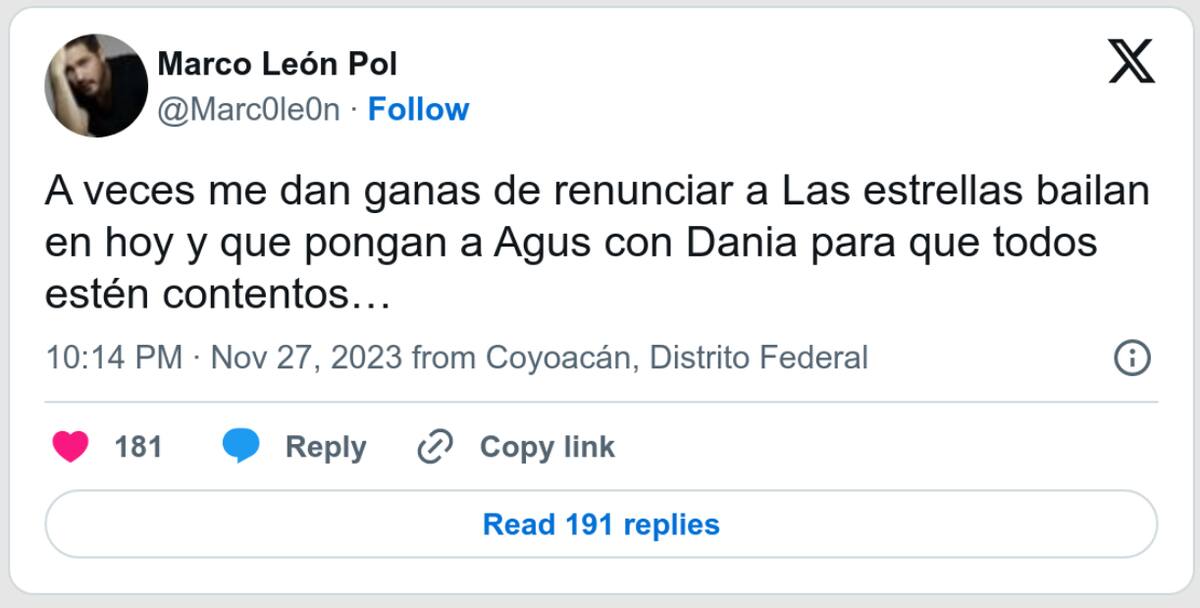 "A veces me dan ganas de renunciar a Las Estrellas Bailan en Hoy y que pongan a Agus con Dania para que todos estén contentos…", manifestó Marco León en su publicación.