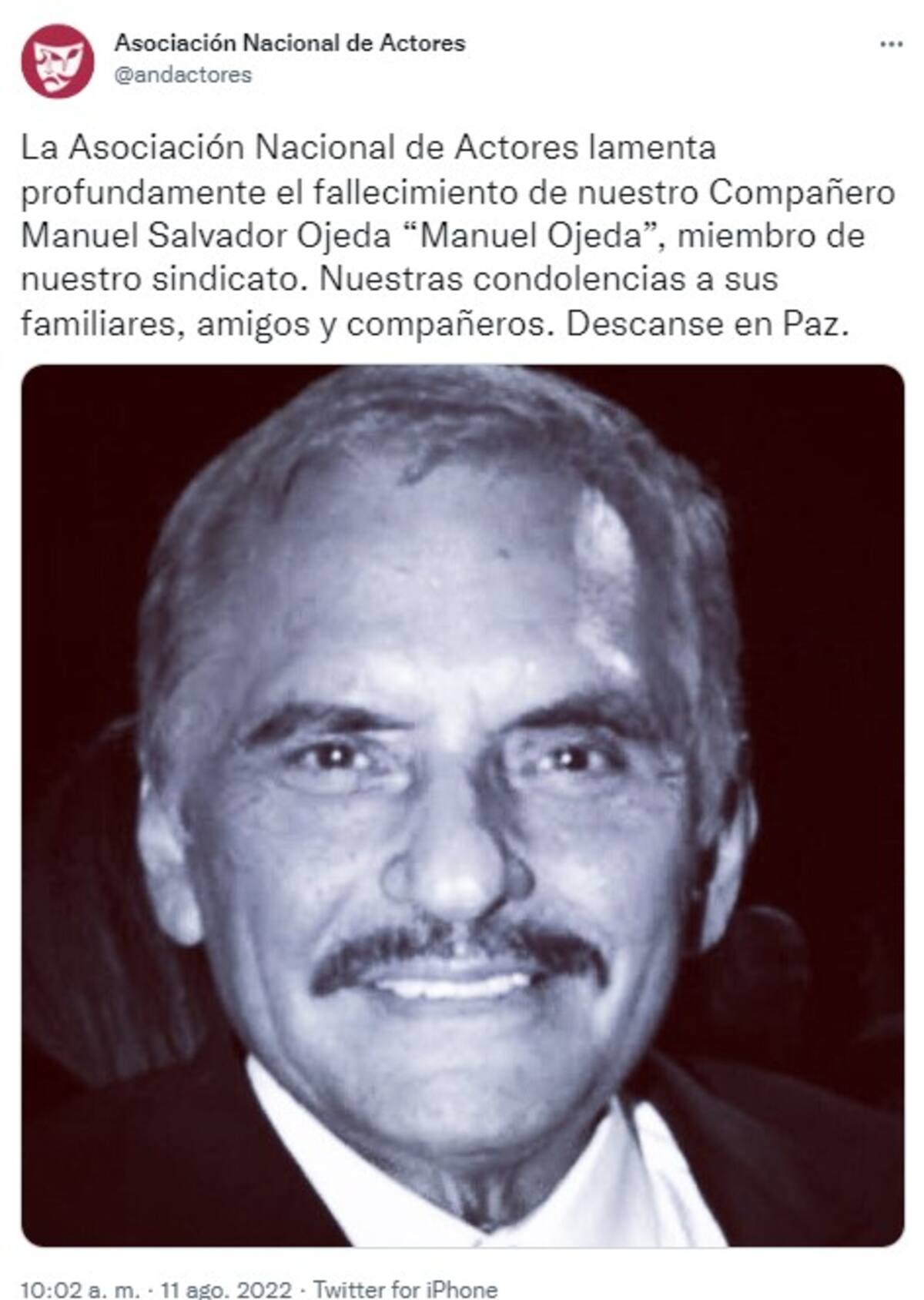 La Asociación Nacional de Actores lamenta profundamente el fallecimiento de nuestro Compañero Manuel Salvador Ojeda “Manuel Ojeda”, miembro de nuestro sindicato. Nuestras condolencias a sus familiares, amigos y compañeros. Descanse en Paz”, escribieron en Twitter.