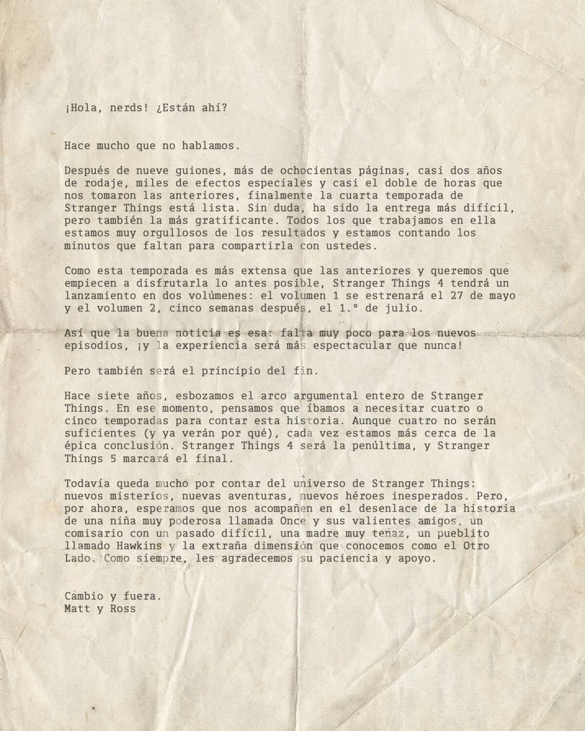 Por medio de las redes sociales del gigante del streaming se publicó una carta en la que se informaba que “Stranger Things 4” se dividirá en dos partes, la primera se estrenaría el 27 de mayo y la segunda se lanzaría el 1 de julio.